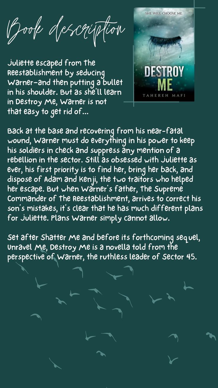Set after Shatter Me and before its forthcoming sequel, Unravel Me, Destroy Me is a novella told from the perspective of Warner, the ruthless leader of Sector 45.