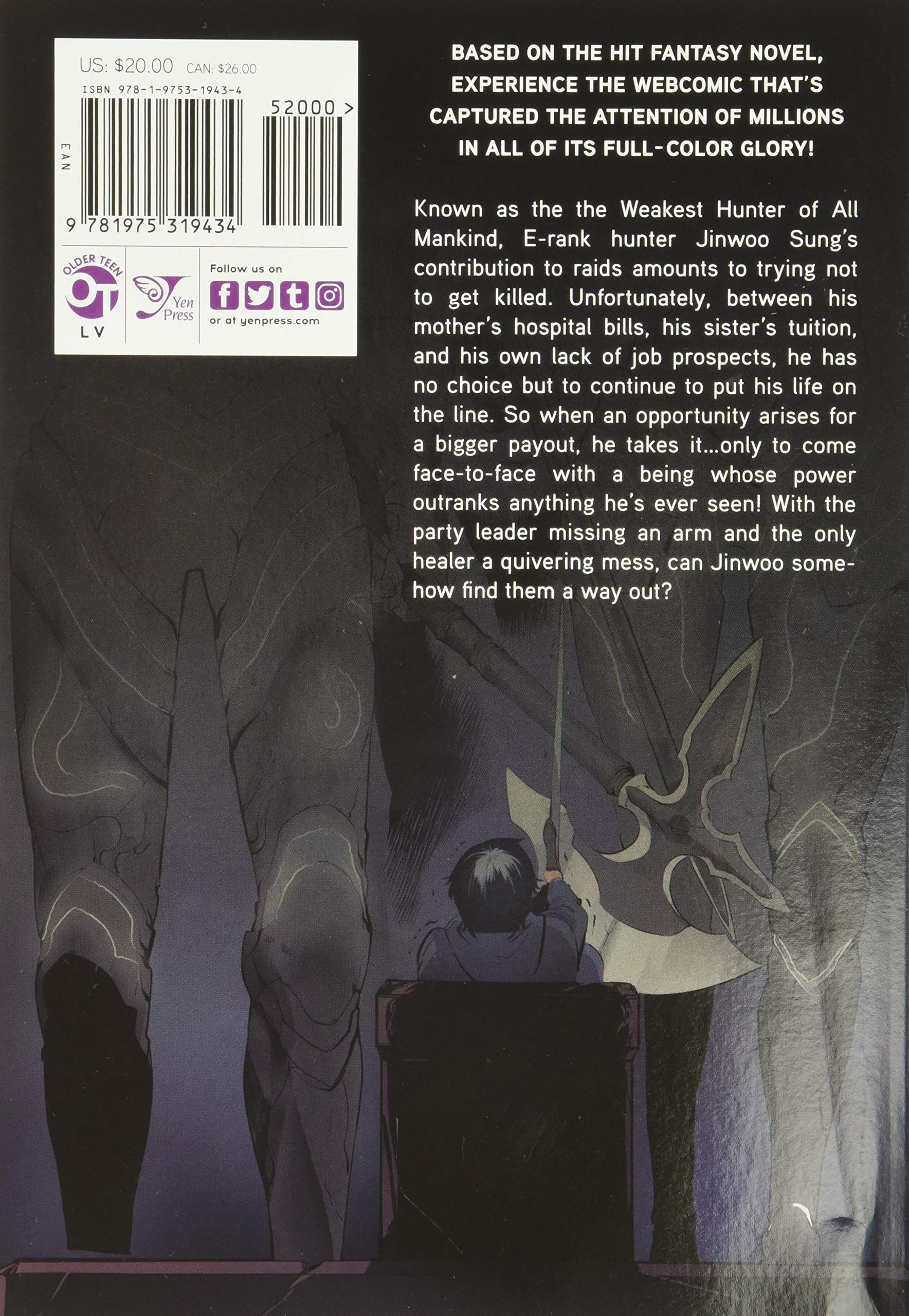 Known as the the Weakest Hunter of All Mankind, E-rank hunter Jinwoo Sung’s contribution to raids amounts to trying not to get killed. Unfortunately, between his mother’s hospital bills, his sister’s tuition, and his own lack of job prospects, he has no choice but to continue to put his life on the line. So when an opportunity arises for a bigger payout, he takes it…only to come face-to-face with a being whose power outranks anything he’s ever seen! With the party leader missing an arm and the only healer a quivering mess, can Jinwoo somehow find them a way out?