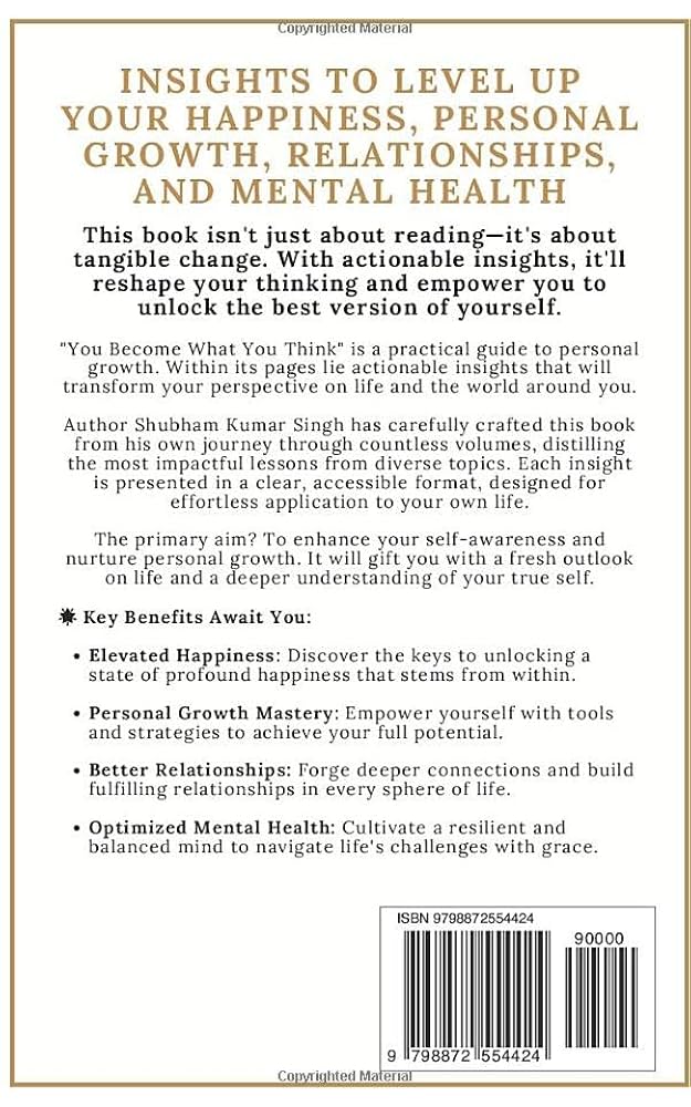 Insights to Level Up Your Happiness, Personal Growth, Relationships, and Mental HealthThis book isn't just about reading—it's about tangible change. With actionable insights, it'll reshape your thinking and empower you to unlock the best version of yourself.Are you searching for a way to improve your life, increase your happiness, and achieve your full potential? I've been there too. And I found my answer in books. They transformed my life, and they can transform yours too."You Become What You Think" is a practical guide to personal growth. Within its pages lie actionable insights that will transform your perspective on life and the world around you. Author Shubham Kumar Singh has carefully crafted this book from his own journey through countless volumes, distilling the most impactful lessons from diverse topics. Each insight is presented in a clear, accessible format, designed for effortless application to your own life.The primary aim? To enhance your self-awareness and nurture personal growth. It will gift you with a fresh outlook on life and a deeper understanding of your true self. Key Benefits Await Elevated Discover the keys to unlocking a state of profound happiness that stems from within.